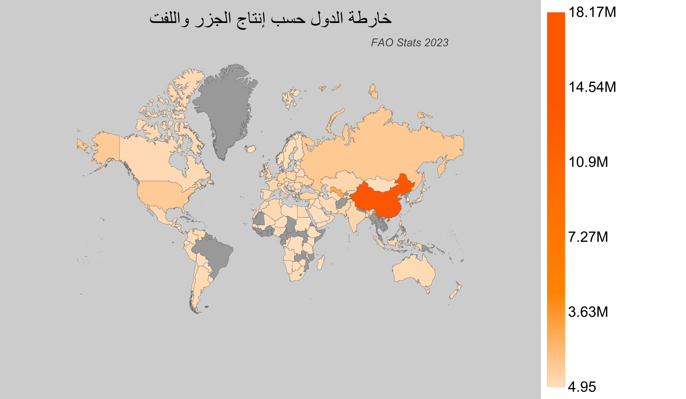 - الصين تقود الإنتاج العالمي للجزر واللفت بحوالي 18.2 مليون طن، وهو ما يمثل جزءًا كبيرًا من الإجمالي العالمي.