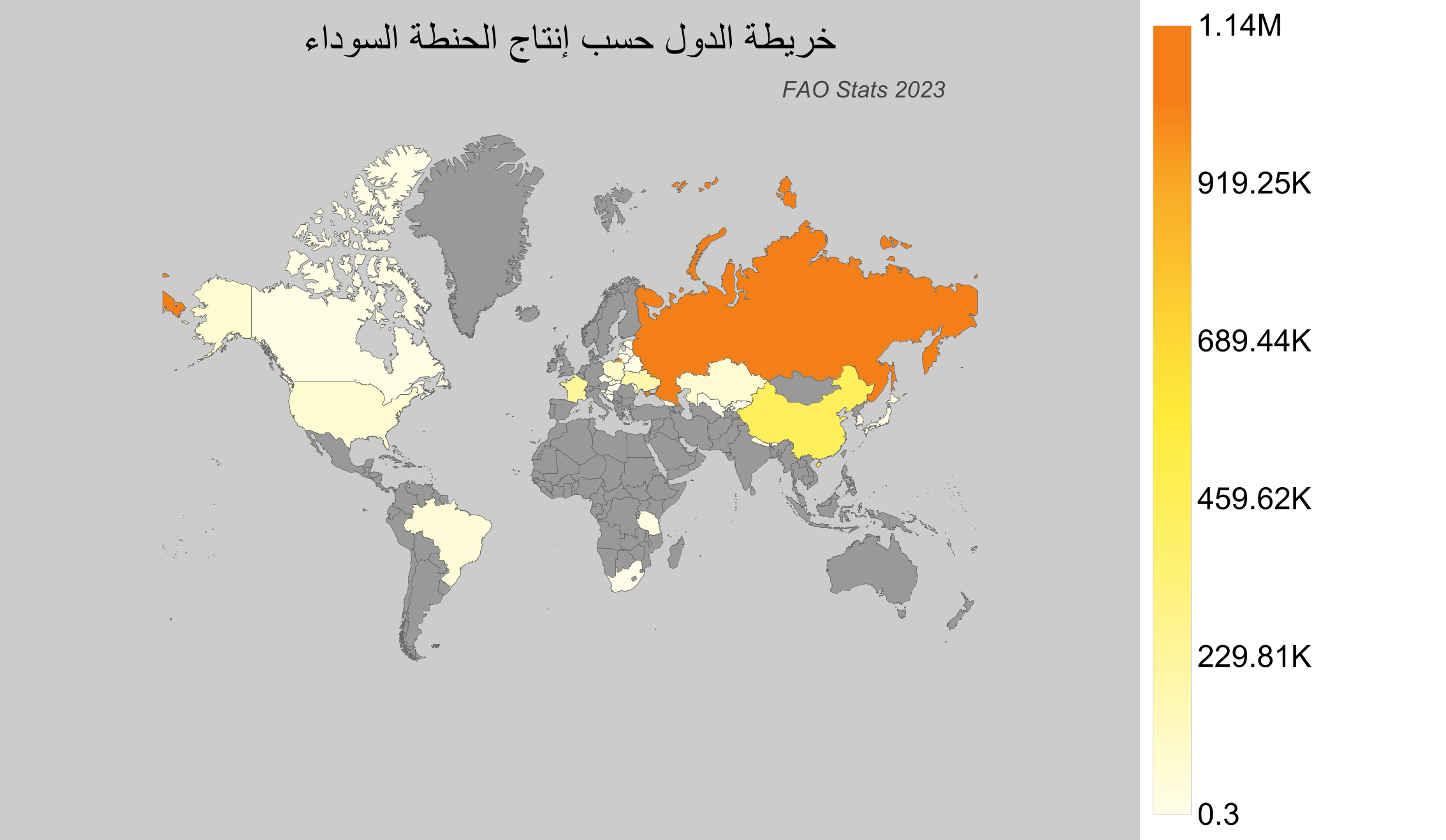 تُعد الحنطة السوداء من المحاصيل الهامة لأهميتها الغذائية ومرونتها في النمو في الظروف المناخية المختلفة. يُمكن زراعتها في المناطق ذات المناخ المعتدل والرطب. البيانات المُقدمة تتعلق بإنتاج عام 2023 وهي أحدث البيانات المتاحة حتى عام 2025 في قاعدة بيانات منظمة الأغذية والزراعة (الفاو).