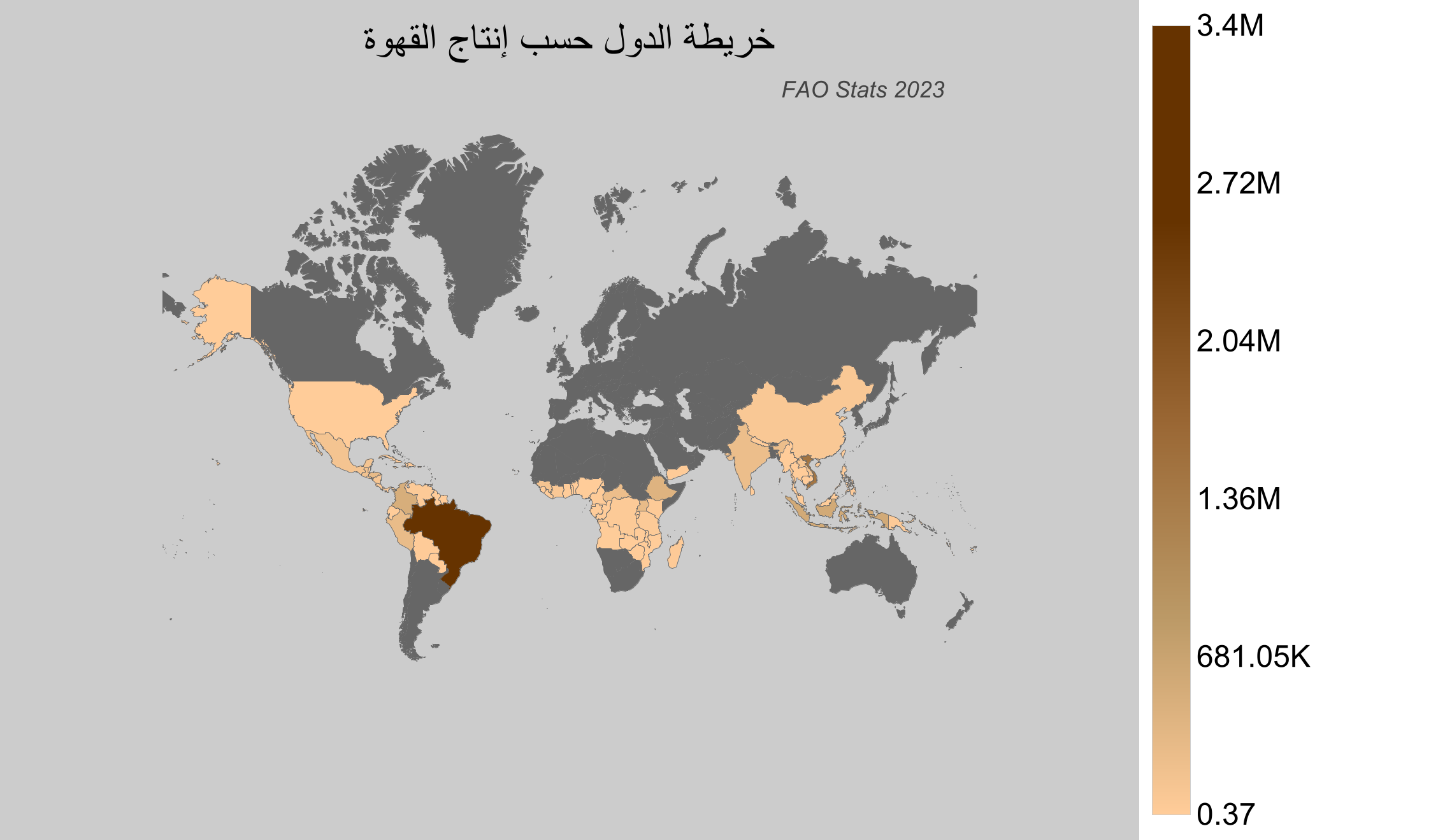 تلعب القهوة دورًا حيويًا في الحياة اليومية لملايين الأشخاص حول العالم، وتُعَد واحدة من أكثر المشروبات استهلاكًا. تنمو القهوة في المناخات الاستوائية والمناطق ذات الهطول المطري الجيد، وهي تتطلب ظروفًا بيئية خاصة لتزدهر. تقدم هذه الصفحة نظرة عامة على إنتاج القهوة العالمي لعام 2023، وذلك اعتمادًا على أحدث البيانات المتاحة في قاعدة بيانات منظمة الأغذية والزراعة حتى عام 2025.