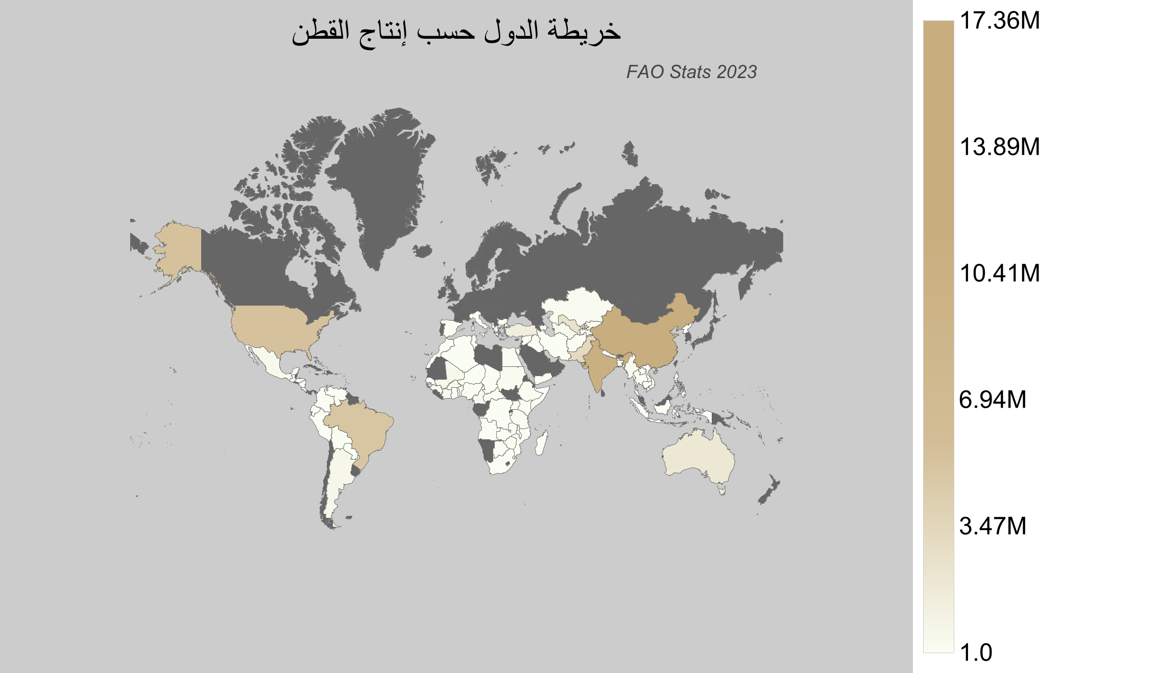 القطن هو أحد المحاصيل الرئيسة التي تلعب دورًا كبيرًا في الاقتصاد العالمي. يُزرع القطن في مناطق ذات مناخ دافئ وجاف وتشمل الأفريقية والأمريكية والآسيوية والاسترالية. تعتبر بيانات عام 2023 أحدث المعلومات المتاحة وفقًا لقاعدة بيانات منظمة الأغذية والزراعة لعام 2025.