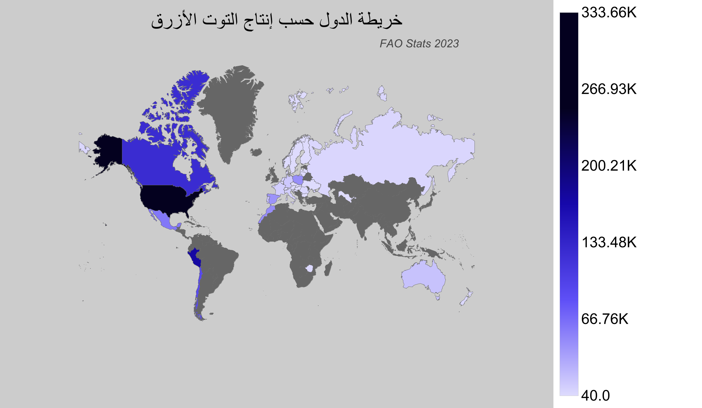يعتبر التوت الأزرق من الفواكه الغنية بالعناصر الغذائية ومضادات الأكسدة، مما يجعله مهمًا للصحة العامة. ينمو التوت الأزرق بشكل رئيسي في المناطق ذات المناخ البارد والمعتدل. تُعد بيانات إنتاج التوت الأزرق لعام 2023 هي الأحدث المتاحة حتى عام 2025 في قاعدة بيانات منظمة الأغذية والزراعة (فاو).