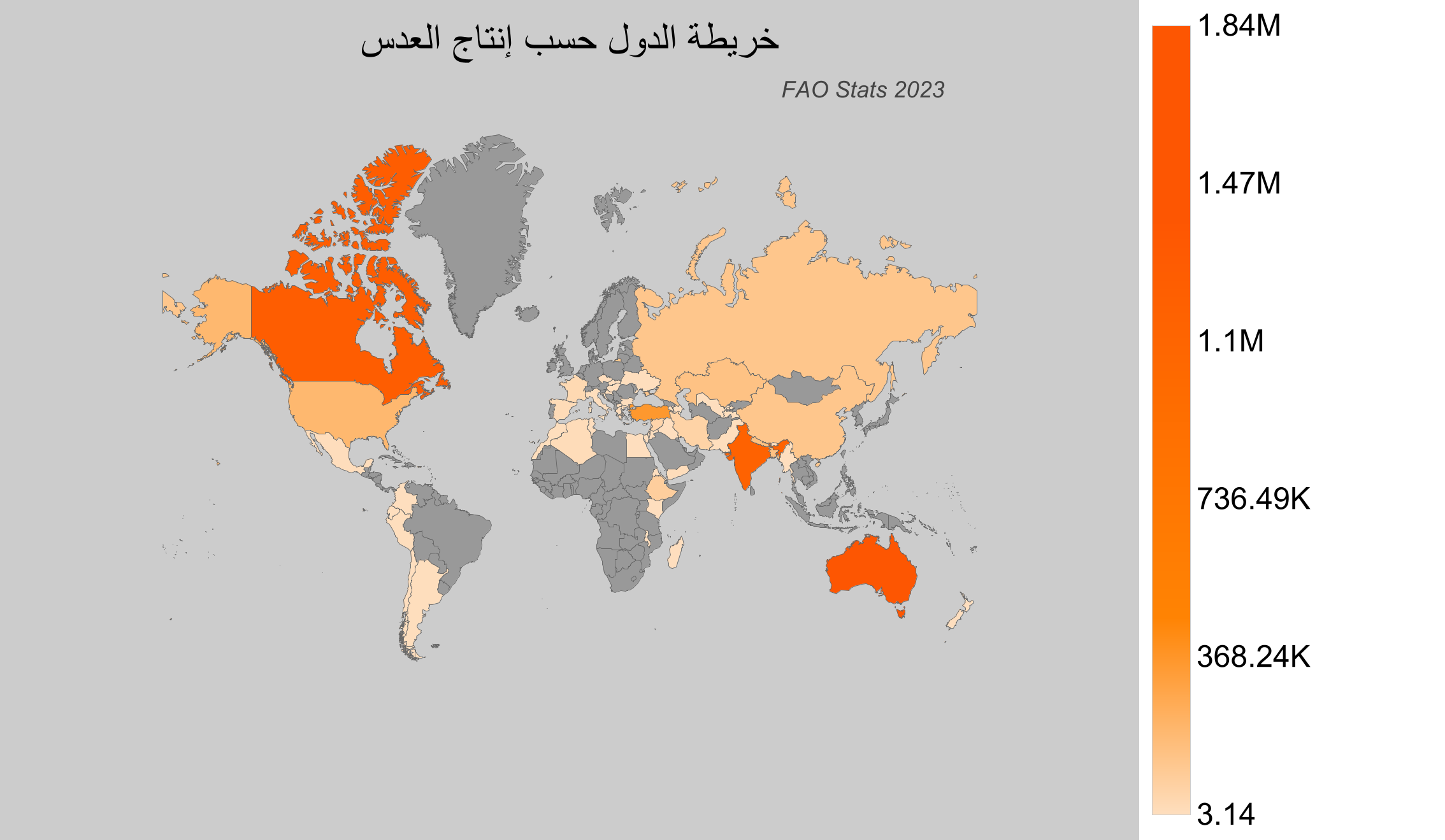 العدس هو واحد من أهم المحاصيل الزراعية في العالم، حيث يُعتبر مصدرًا غذائيًا رئيسيًا غنيًا بالبروتينات النباتية، وهو يحظى بشعبية خاصة في المناطق ذات المناخ المعتدل والجاف. ينمو عادة في تربة عميقة جيدة الصرف وفي المناطق شبه القاحلة. تتيح بيانات إنتاج العدس لسنة 2023، المتاحة حتى عام 2025 من خلال قاعدة بيانات منظمة الأغذية والزراعة، نظرة شاملة حول التطورات الإنتاجية لهذا المحصول الهام.