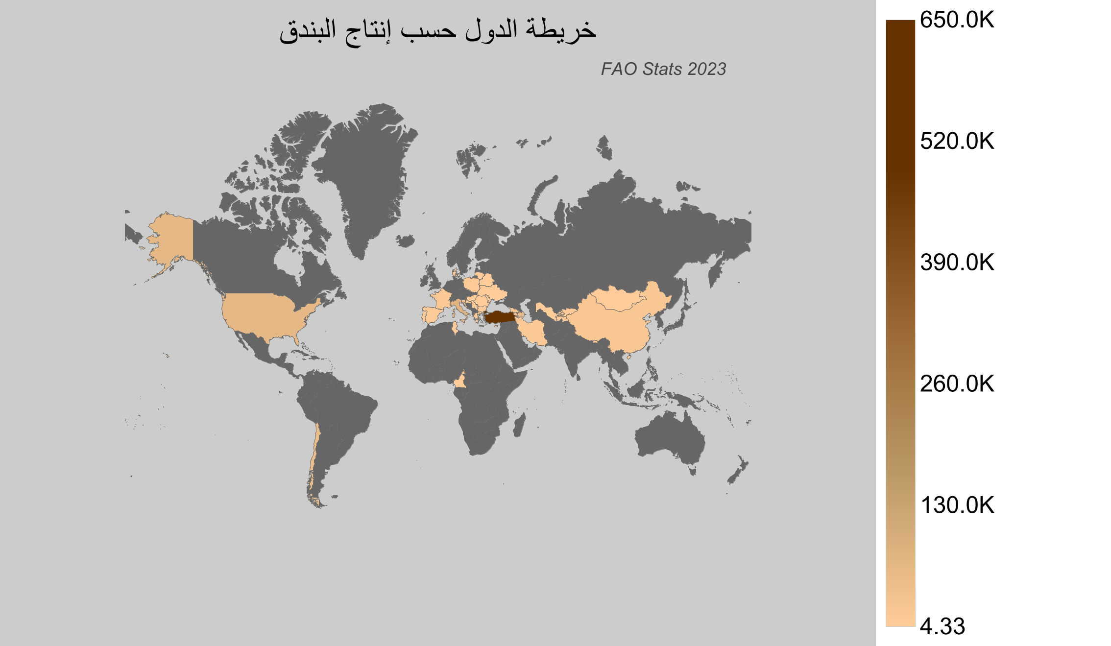 البندق يعد من المكسرات الغنية بالعناصر الغذائية والفيتامينات، ويدخل في العديد من الصناعات الغذائية. ينمو البندق في المناخ المعتدل ويتطلب تربة خصبة وظروفاً مناخية ملائمة للنمو الجيد. تعتمد مناطق زراعته على المناخ وخصوبة التربة. يقدم هذا التقرير بيانات إنتاج البندق العالمية لعام 2023، وهي أحدث البيانات المتاحة في قاعدة بيانات منظمة الأغذية والزراعة (FAO) حتى عام 2025.