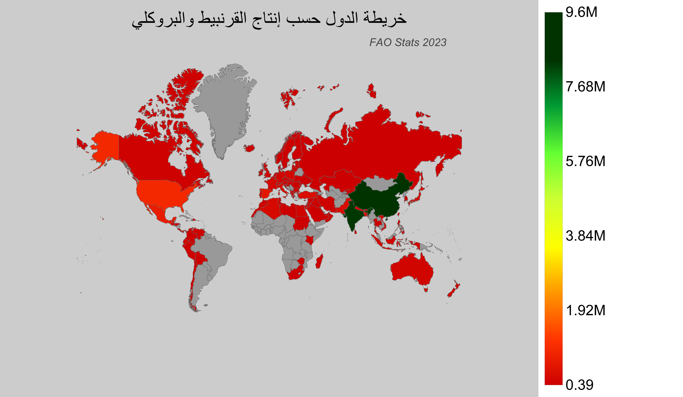 يعتبر القرنبيط والبروكلي من الخضروات الهامة بسبب فوائدها الصحية العديدة والمحتوى الغذائي الغني. يزرعان عادة في الأجواء المعتدلة والرطبة، ويفضلان التربة الغنية بالعناصر المغذية. البيانات المعروضة لعام 2023 تمثل أحدث المعلومات المتاحة من قاعدة بيانات منظمة الأغذية والزراعة (الفاو) ، وتوضح مدى أهمية هذه المحاصيل في تغذية سكان العالم وتستمر في النمو على مر العقود.