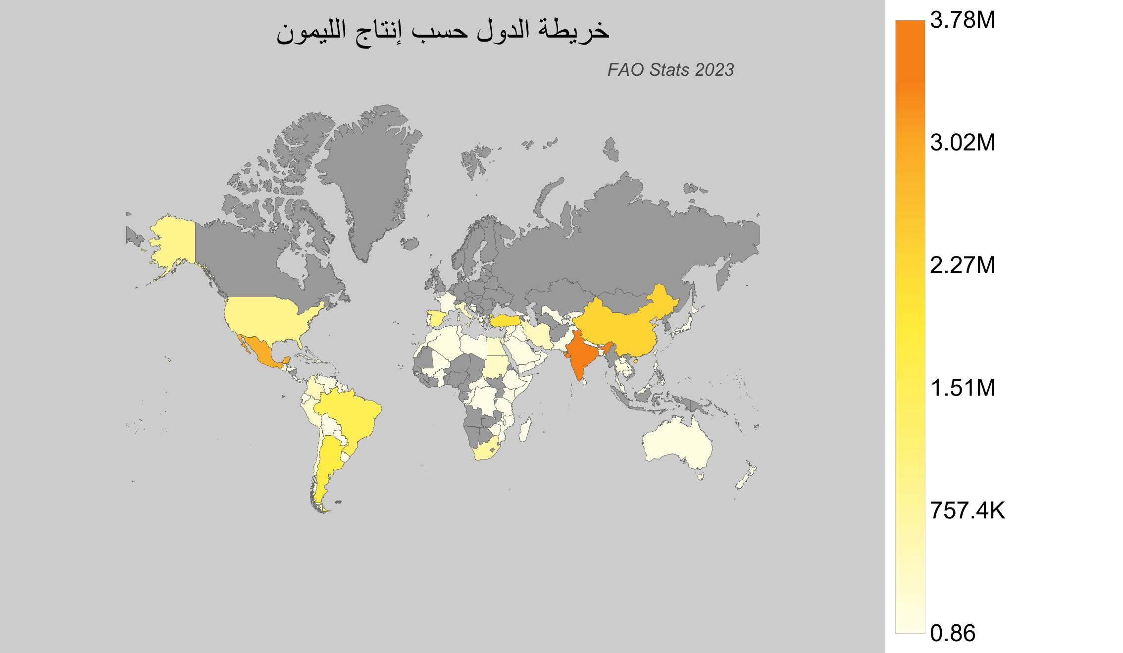 إن الليمون هو أحد أهم المحاصيل الزراعية نظراً لقيمته الغذائية العالية واستخداماته المتعددة، سواء في الطهي أو صناعة المشروبات. يتم زراعة الليمون بشكل خاص في المناطق ذات المناخ المعتدل إلى الحار والجاف. هذه الصفحة تستعرض أحدث البيانات المتاحة عن إنتاج الليمون في العام 2023 من قاعدة بيانات منظمة الأغذية والزراعة (FAO).