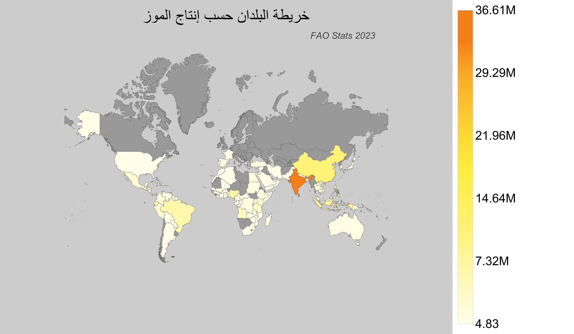 يُعتبر الموز من الفواكه المهمة عالميًا نظرًا لقيمته الغذائية العالية واستهلاكه الواسع. ينمو بشكل أساسي في المناطق الاستوائية حيث تتوفر درجات الحرارة العالية والرطوبة، مما يجعله محصولًا رئيسيًا في هذه المناطق. البيانات المعروضة لآخر إحصائية متوفرة للعام 2023، بناءً على قاعدة بيانات منظمة الأغذية والزراعة (FAO) لعام 2025.