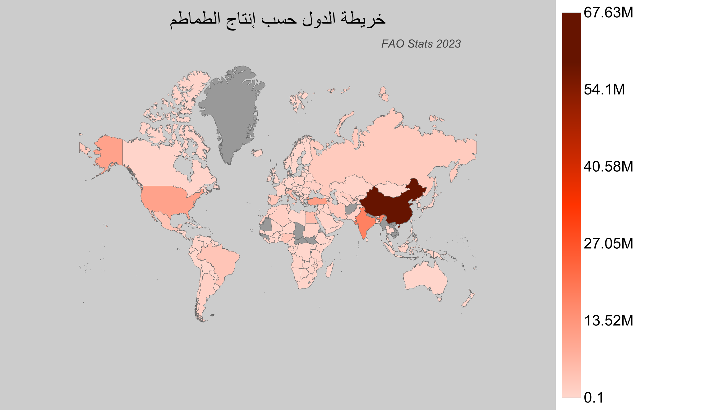 الطماطم هي واحدة من المزروعات الأساسية حول العالم بسبب قيمتها الغذائية العالية واستخداماتها المتعددة في الطهي. تنمو الطماطم بشكل مثالي في المناخات الدافئة والمعتدلة، مما يجعلها محصولًا شائعًا في العديد من المناطق الزراعية. تقدم هذه الصفحة بيانات منظمة الأغذية والزراعة (FAO) لعام 2023، وهي الأحدث حتى عام 2025، لتسليط الضوء على أهمية الطماطم في الاقتصاد الزراعي العالمي.