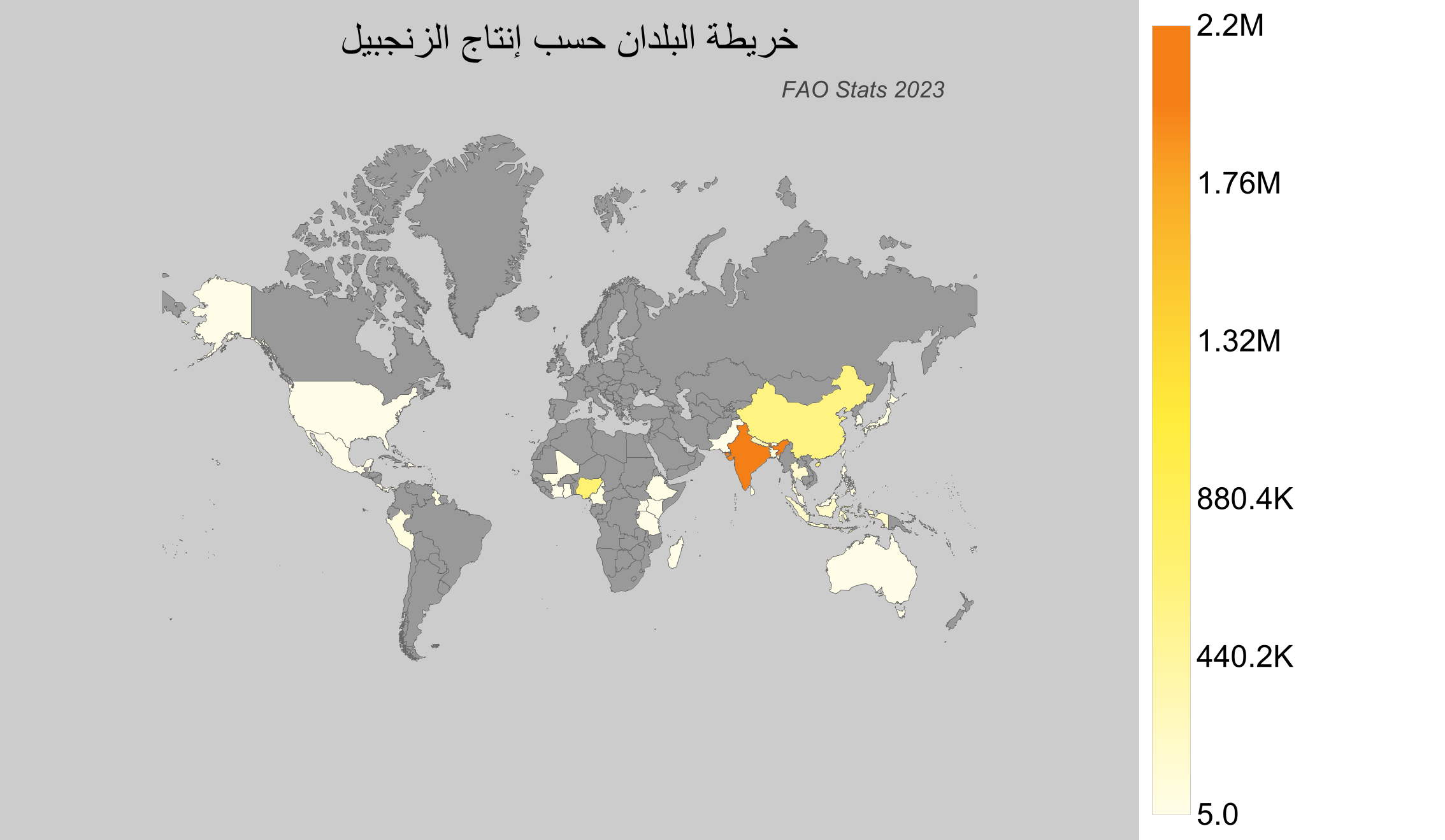 الزنجبيل هو نوع من البهارات الذي يتميز بفوائده الصحية والطبية العديدة، ويُستخدم في الطهي وبعض العلاجات الشعبية. يزرع الزنجبيل في المناطق الاستوائية حيث يتطلب مناخًا دافئًا ورطبًا نسبيًا. في عام 2023، أظهرت قاعدة بيانات منظمة الأغذية والزراعة (FAO) أحدث البيانات حول إنتاج الزنجبيل في العالم، مما يشير إلى نمو متزايد في إنتاج هذه السلعة الحيوية.