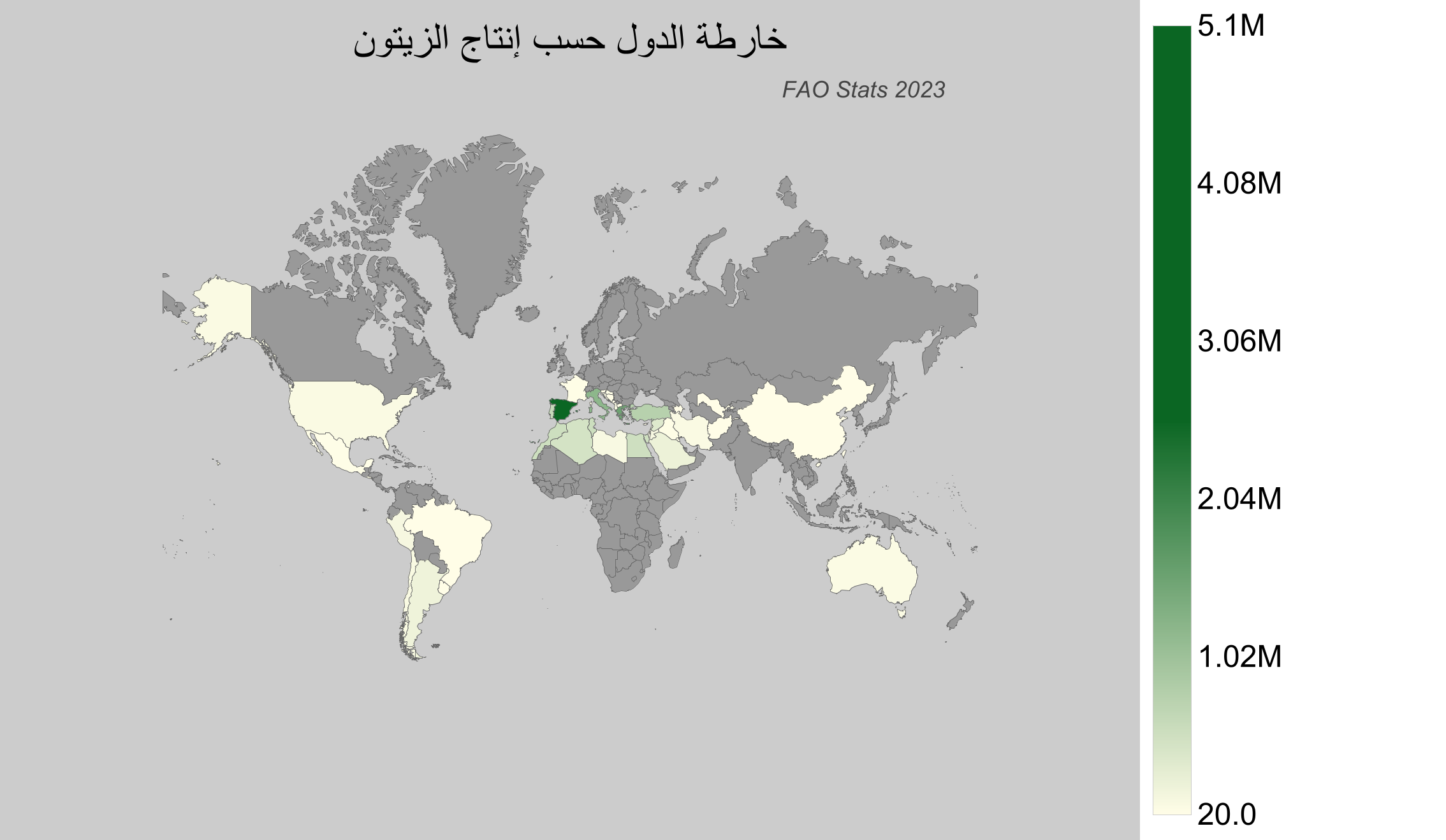 الزيتون هو محصول ذو أهمية اقتصادية وغذائية كبيرة ويُعتبر جزءًا هامًا من النظام الغذائي في العديد من الثقافات. ينمو الزيتون بشكل رئيسي في المناطق التي تتميز بمناخ البحر الأبيض المتوسط المعتدل والتي توفر الظروف المثالية لنمو الأشجار. يزدهر الزيتون في المناطق ذات الشتاء المعتدل والصيف الحار والجاف. تُقدّم هذه الصفحة معلومات حول إنتاج الزيتون لعام 2023 وفقًا لما توفره قاعدة بيانات منظمة الأغذية والزراعة (FAO) حتى عام 2025.